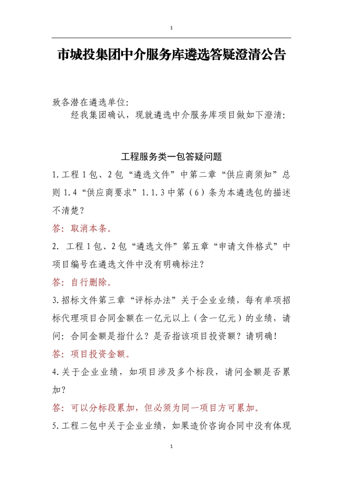 市城投集團中介服務(wù)庫遴選答疑澄清公告