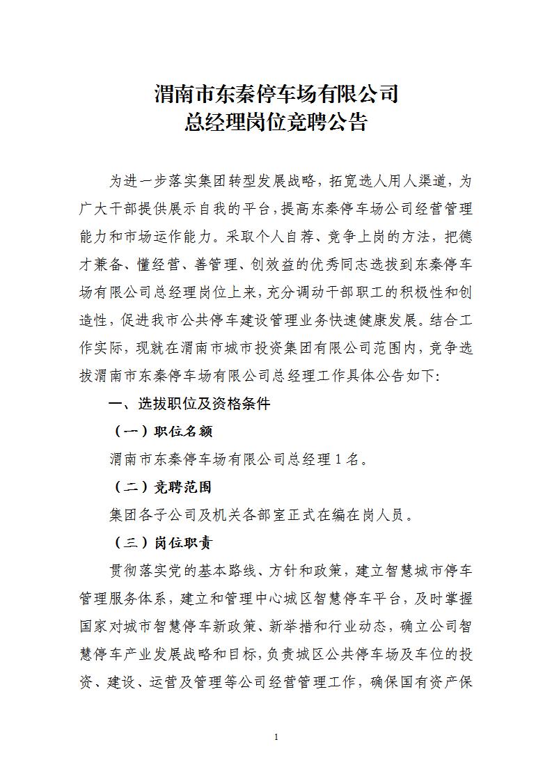 渭南市東秦停車場(chǎng)有限公司總經(jīng)理崗位競(jìng)聘公告